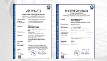 鋼結構制作、安裝一級資質,通過了ISO9001-2000質量管理體系的認證、ISO14000環境管理體系認證、ISO18000職業健康安全管理體系認證以及EN1090認證,美國AISC認證。